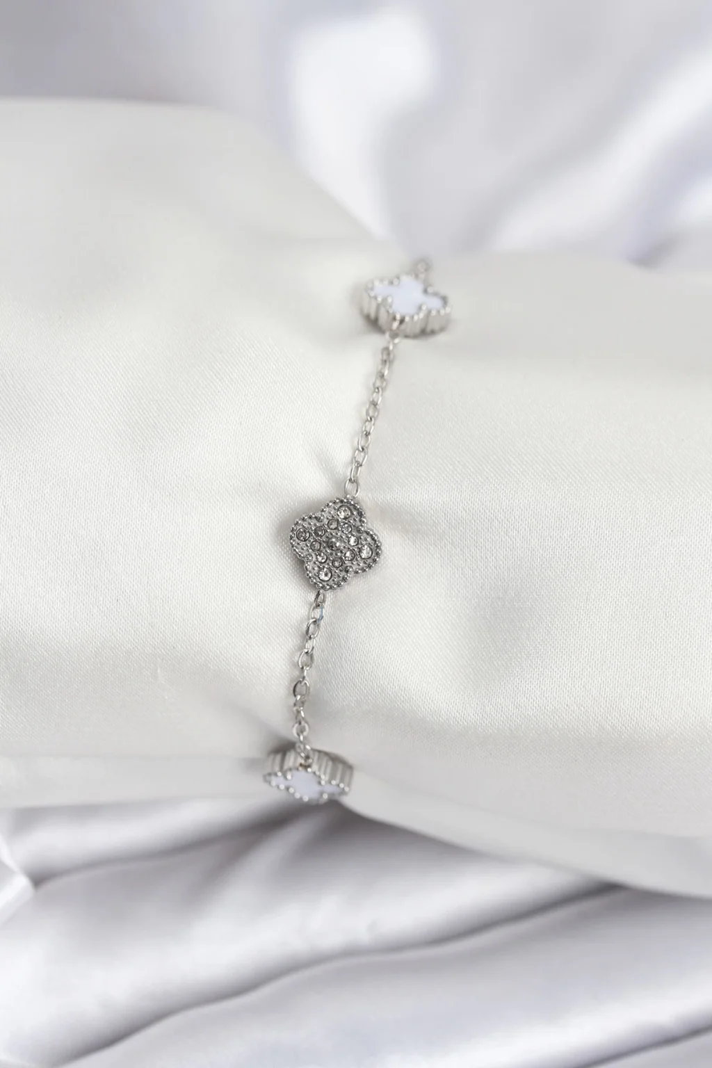 316L Çelik Gümüş Renk Beyaz ve Zirkon Taşlı Baby Boy Yonca Kadın Bileklik