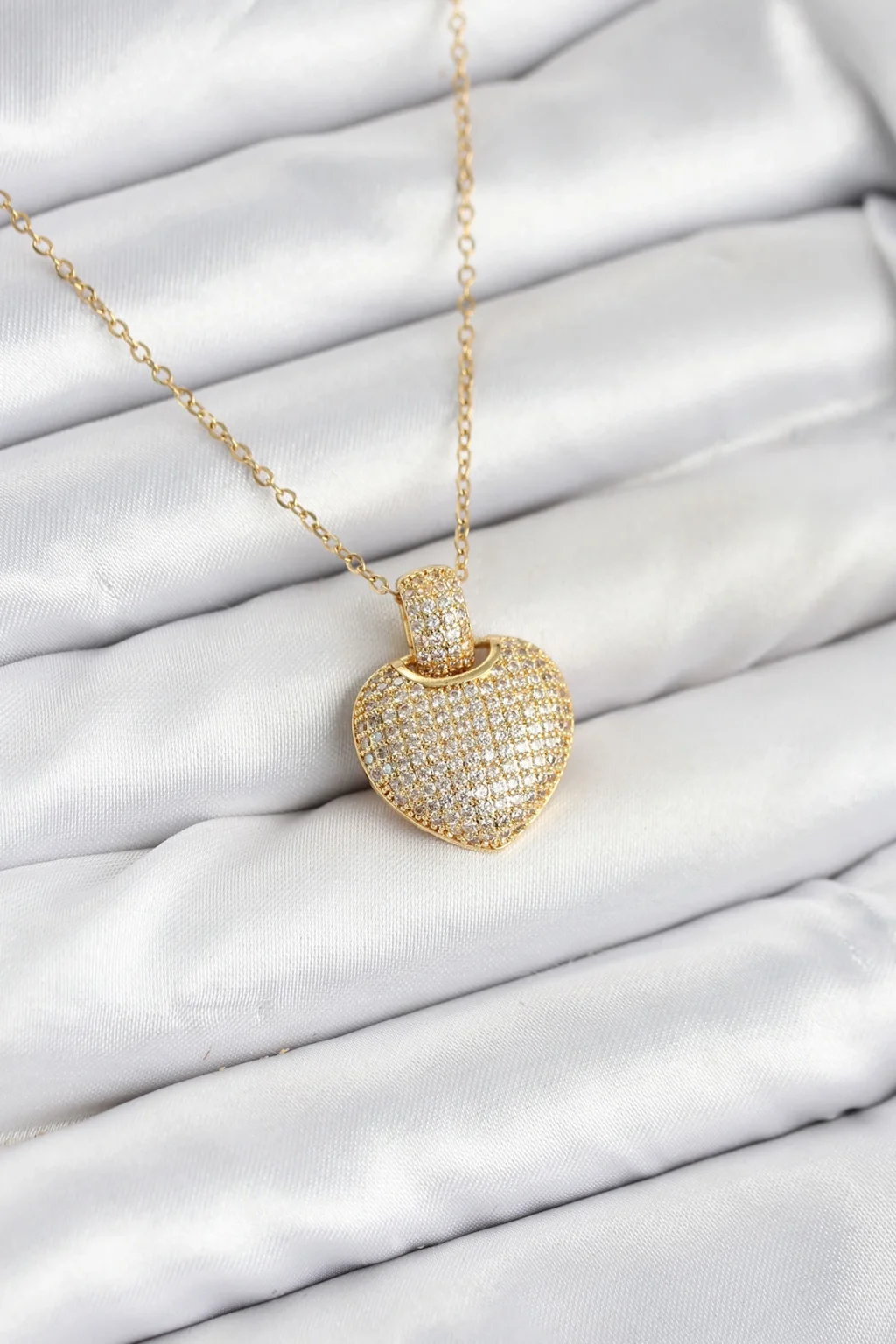 316L Çelik Zincir Gold Renk Zirkon Taşlı Kalpli Kadın Kolye