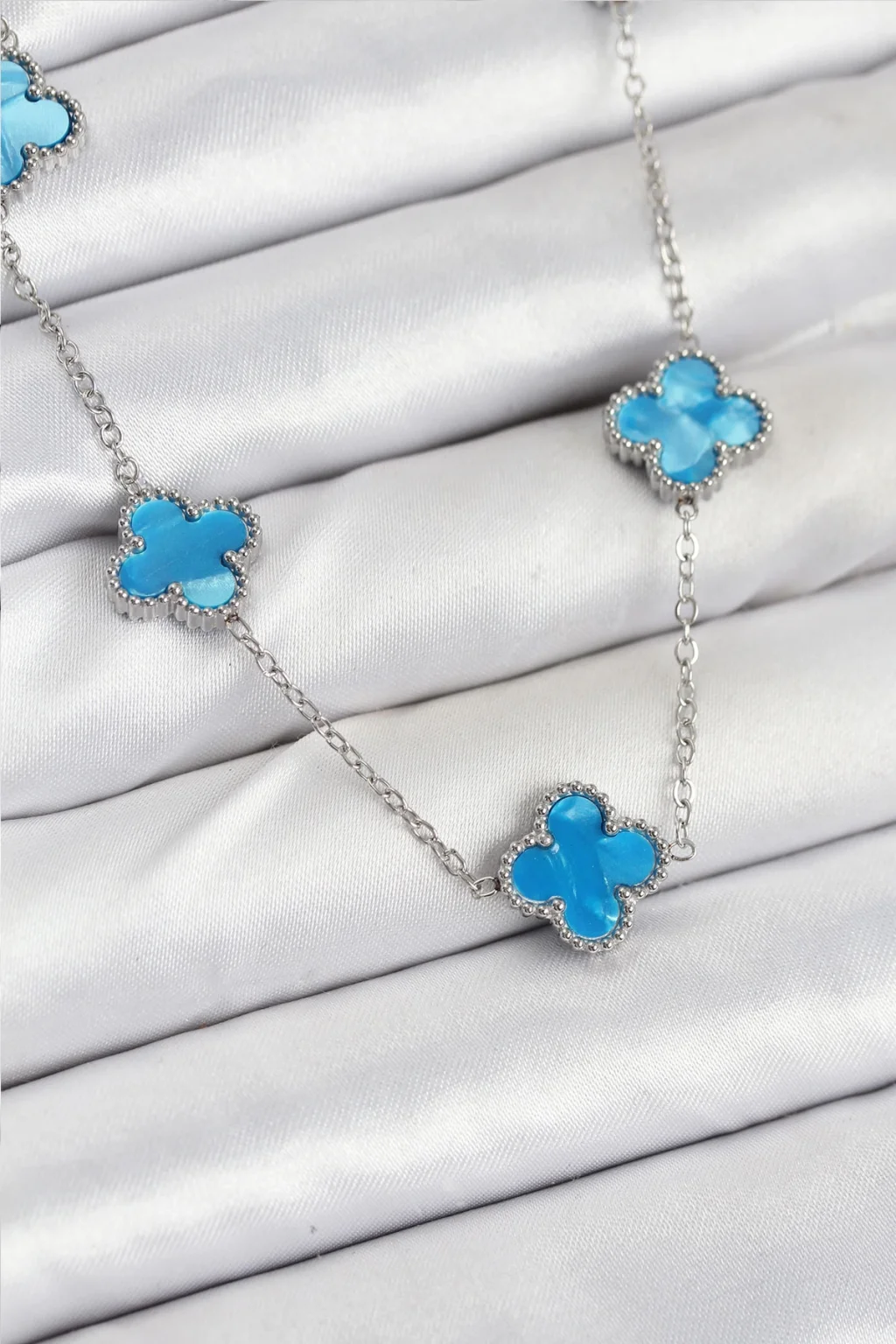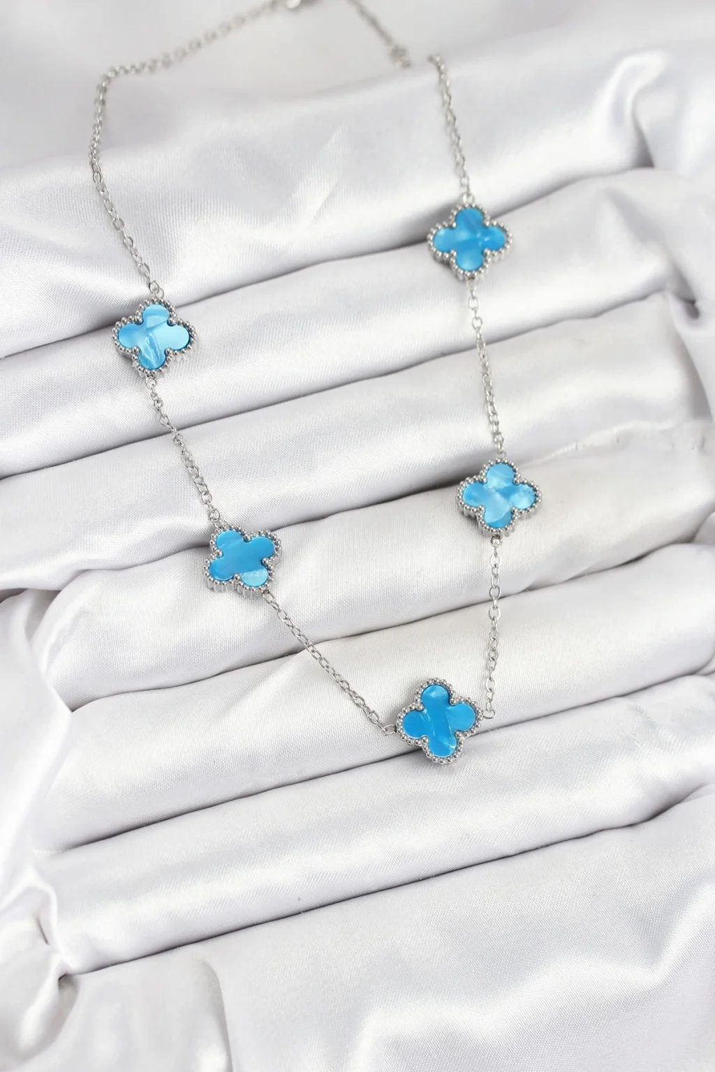 316L Çelik Zincir Gümüş Buz Mavisi Renk Yonca Kadın Kolye
