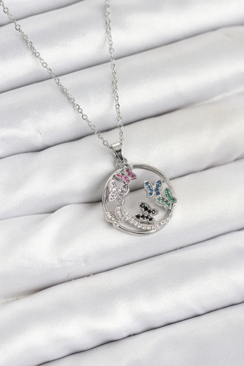 316L Çelik Zincir Gümüş Renk Zirkon Taşlı Kelebekli Kadın Kolye