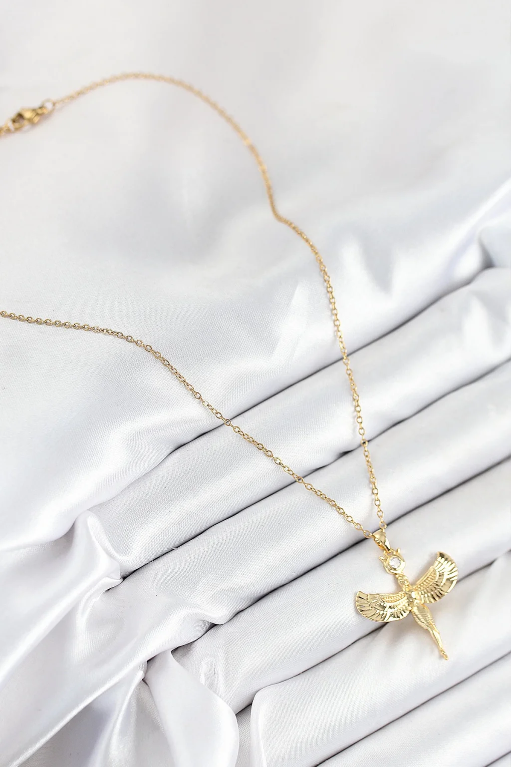 316L Çelik Zirkon Taşlı Melek Model Gold Renk Kadın Kolye