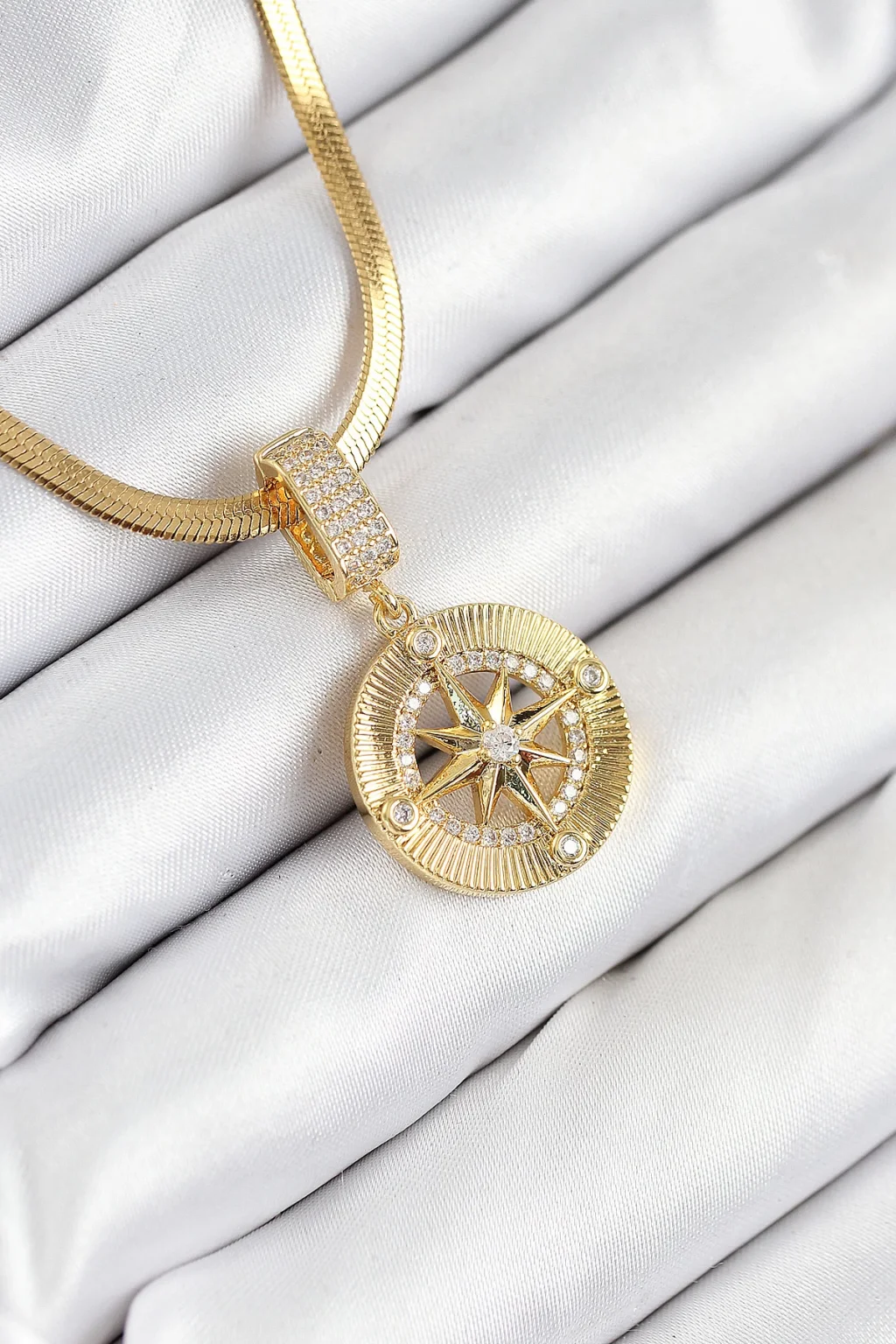 316L Çelik Zirkon Taşlı Pusula Model Gold Renk Kadın Kolye