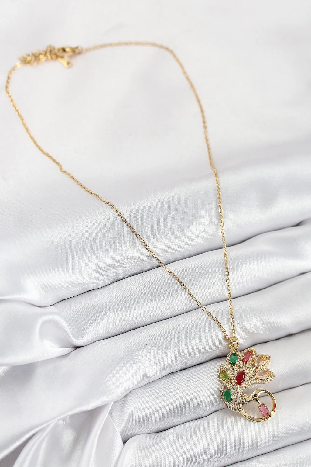 316L Çelik Zirkon Taşlı Tavus Kuşu Model Gold Renk Kadın Kolye