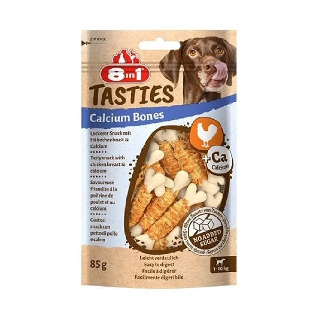 Kolayca sindirilebilir, ilave şeker içermez ve yağ oranı düşüktür. Lezzet arttırıcılar, GDO'lar, yapay koruyucular ve renklendirici maddeler olmadan formüle edilirler. Fırında pişmiş ikramlar protein açısından zengindir. 8in1 Tasties Calcium Bones, küçük ve çok küçük cins köpekler için ideal bir atıştırmalıktır. Köpeğinizin lezzetli Kalsiyum Kemiklerimizin tadını çıkarmasına izin verin!