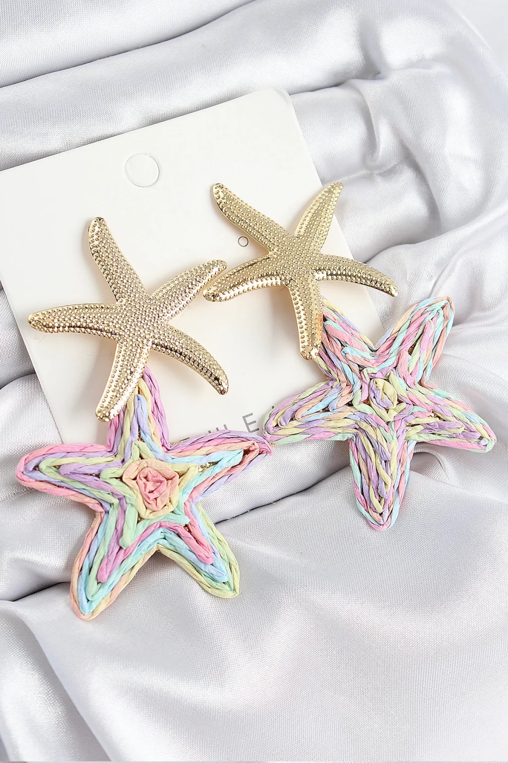 Pirinç Sallantılı Rainbow Deniz Yıldızı Model Gold Renk Hasır Küpe