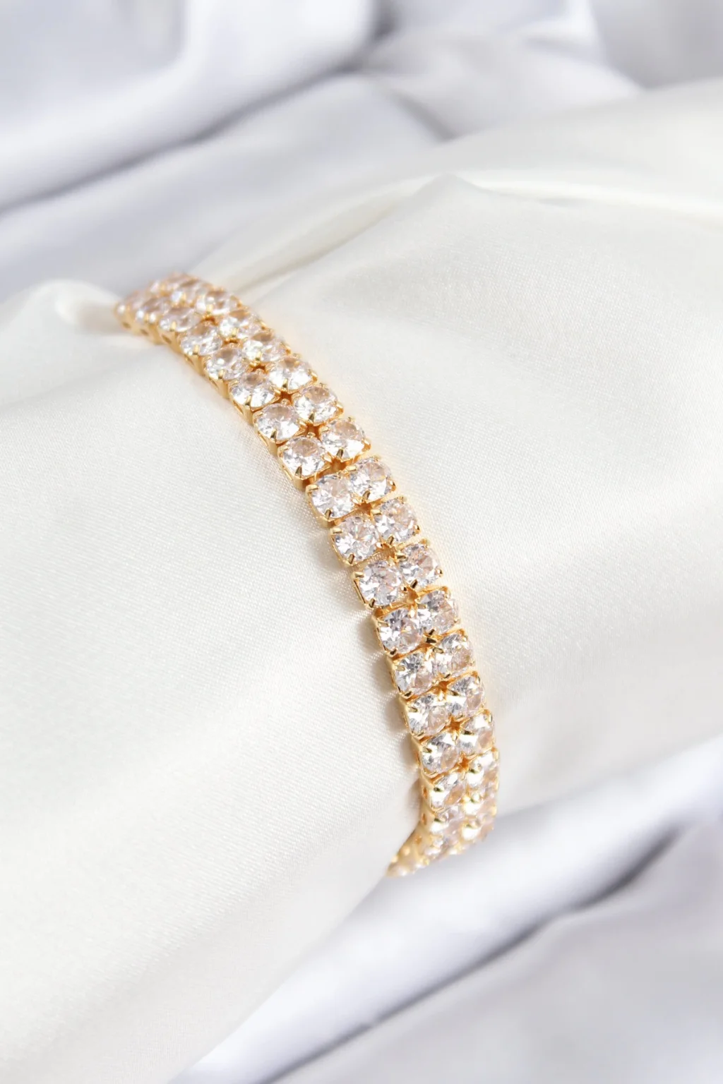 Pirinç Zirkon Taşlı Çift Sıra Kare Model Gold Renk Asansörlü Kadın Bileklik