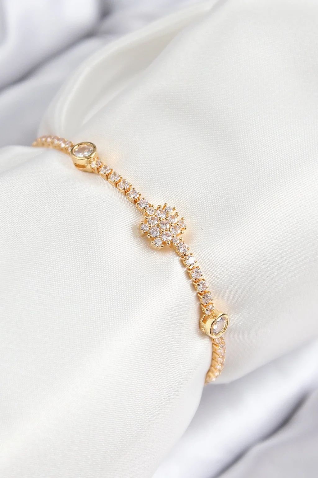 Pirinç Zirkon Taşlı Kar Tanesi Model Gold Renk Asansörlü Kadın Bileklik