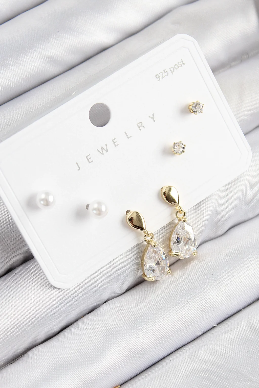 Pirinç Zirkon Taşlı Sallantılı Damla Model Gold Renk 925 Ayar Gümüş Çivi Kadın Küpe Set
