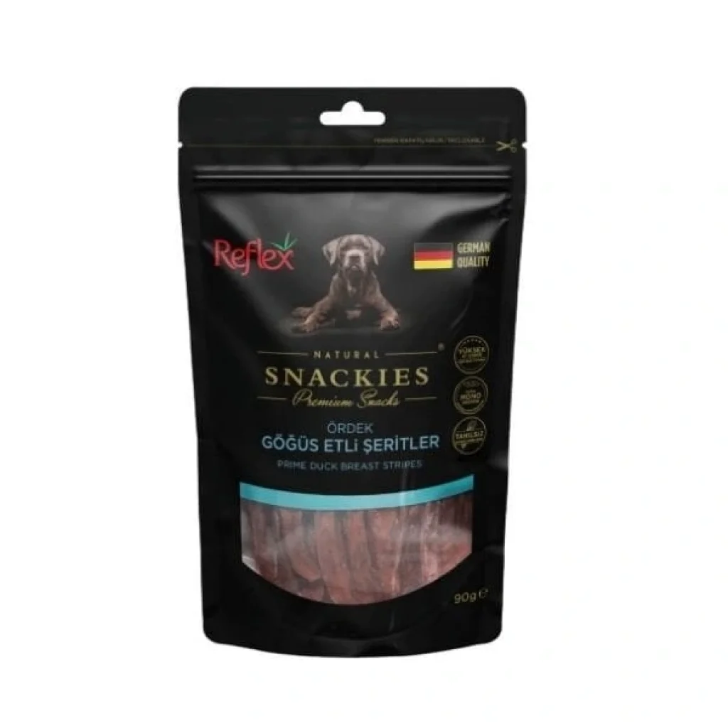 Reflex Snackies Natural Ördek Göğüs Etli Şerit Tahılsız Köpek Ödül Maması 90 Gr: Köpeğinizin sağlıklı ve lezzetli bir ödül deneyimi yaşaması için özel olarak tasarlanmış bir üründür. Yüksek kaliteli ördek göğsü ile zenginleştirilmiş formülü, köpeğinizin kas gelişimine katkı sağlar ve günlük beslenmesine tat katarken aynı zamanda doğal içeriklerle destekler.
