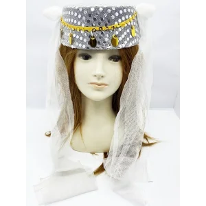 Beyaz Duvaklı Altın Pul İşlemeli Kına Fesi Kına Şapkası Oryantal Şapkası