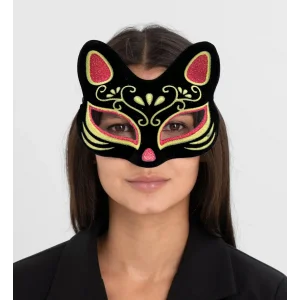 Siyah Renk Süet Kaplama Üzeri Kırmızı Sarı Simli Kedi Maskesi 17x14 Cm